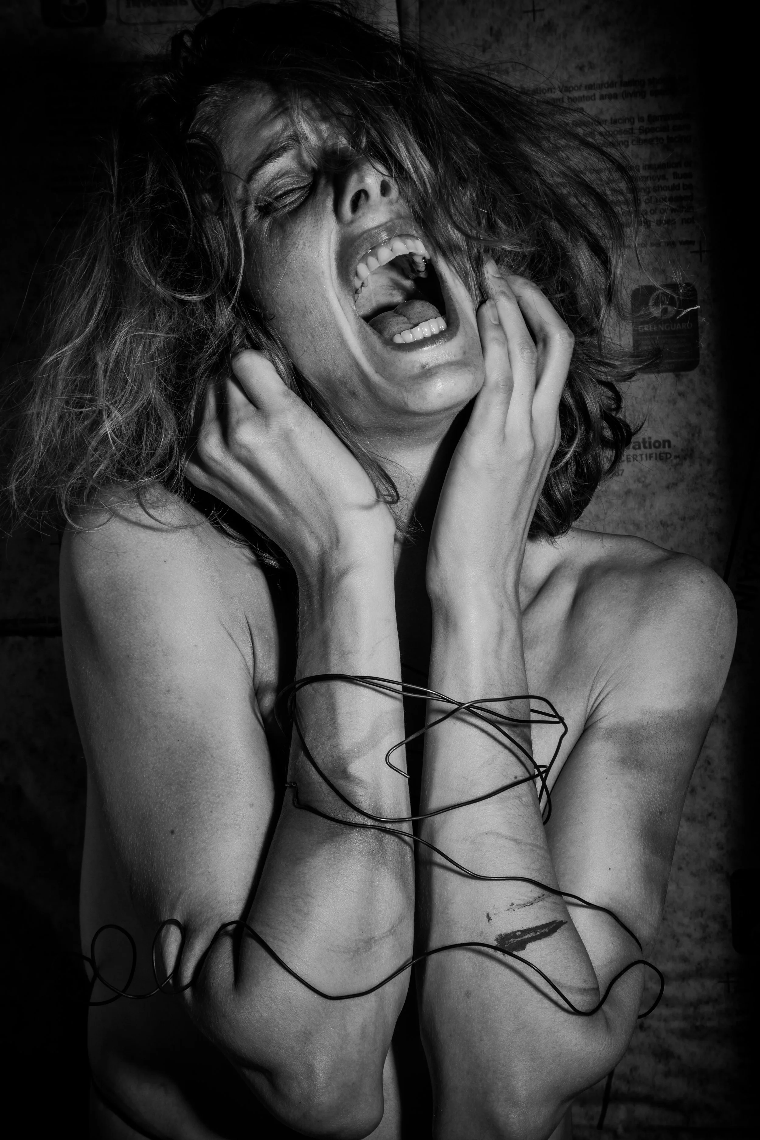 a pain behind the eyes, tied to a gear twisting inside tightening all the threads of my being until my thoughts are wild, eyes blurry, chest tight, teeth grinding, screaming inside. a blade grazing the skin making hair stand on end, gave me goosebumps.